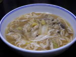朝早くからのスケジュールをこなし、12時30分に昼食会から始まった、額賀財務大臣との懇話会に出席してきました。一番の印象はマスコミが一斉に会議室に入った時の2名のSPの方の目配りでした。テレビの「SP」と偉い違いで、迫力です。そんなことより「で、どうだった?」なんですが、20程の各界の方々の半分が意見陳述し、一人ずつに丁寧にご回答くだっさのですが、残り2名が意見を述べて、時間切れで発言のできなかった方が多数いらっしゃり、おきのどくでした。幸い前半の発言グループだったので1分半ほど、NPOの税制改革に触れましたが、そのお答えは「社会の大切な勢力」という実感はお持ちではないご様子。「消費税」「年金」「介護保険料」などはテーマである「少子高齢化」の身近な関心事ですからね・・。行政サービスの代行機関ではない、主体的、自主的な活動をもっと社会化しないと、声は遠くまで、届かないのかも知れません。それにしても丁寧だったのは、この時期だから?そんな訳で写真はいつか作った「カレー煮込みうどん」です。うどんは冷凍のまま入れてしまいます。便利です。