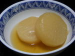 昨日の強風はすごかったです。金沢駅前で建築中のビルのパイプ足場が道路に崩れました。実はJRで津幡の高専に行く途中、金沢駅で見ました。崩壊1時間半くらい前です。足場を覆うシートが、幽霊ボロビルのように空にはためき、見た途端「なんだか危ない工事ビルだな!」と、気になって、デジカメ撮って路上生態研究のネタにと、一瞬頭をよぎりました。そいつがやっぱり!!本能のまま行動していれば、きっとその写真は紙面を飾って社会のお役に立てたに違いありません。過ぎたことは括弧でくくるとして、もう、銀行やら臨時総会発送やら、メール返事やら、電話やら、なんやらかんやらの年度末突入気分の一日でした。そんな訳で金沢ブランド加賀野菜のひとつ、源助だいこんを使った「ふろふき大根」です。たれ味もありますが、土曜に作って日曜に頂いた、汁味タイプです。かつお出汁でやさしく一晩寝かせると、味か゜真まで浸みて、とろとろでしたぁ(~o~)。