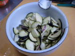 いちにち一日を、大切にと書いたばっかしなのに、とても眠たい一日であります。週末ガス欠状態てす。なんとか奮起で郵便物やメール、タイトルづくりなど細々な雑用処理でした。今夜は「協働をすすめる市民会議」です。終了してから「ちよっとここらで盛り上げ会」という懇親会を設定したのですが、こちらへの参加者は2名足らずで、はかなく流会(-_-;)。今一ノリが悪いですが、12月2日のシンポジウムに力を集めましょう!そんな訳で昨晩のキッチンドリンカーのおつまみです。「なすの簡単漬物」です。なすを薄切りに切って 塩をふりかけ、手できゅっきゅつともみます。5分もすると水が出て写真右のようにくったりしてしまいます。ちよっと塩味が濃かったら水でもんで水分を切ります。簡単な「なすの漬物」の完成です。これをつまみながら、お料理するのでありました。