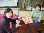 先月末頃から、お尻に火のついていた仕事が、とまずやっとひ終了!! \(~o~)/。後は仕込んだ事柄の動きに反応し、坦々と事務処理を遂行するだけです。ここらでちょいと一息ですな。i−ねっと事務所は幾つかの事務局委託をしていますが、週に2回程、「かなざわ総合スポーツクラブ」さんが、パソコン3台持ち込みで、経理作業などにいらっしゃいます。今日のお昼休みに、先週福岡からゲストでいらっしゃった古賀さんが「おみや」してくれた「辛しめんたい煎餅」をお出しした所、スタッフのお二人「辛くて美味しい!」と絶賛。思わずパチリ!です〜。