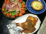 午前中、郵便局と銀行×2を回りました。年末に合わせ25日とあって、どこも長蛇の番号札持ちです。帰りにデパ地下寄ってお弁当買いました。ここも人だらけ。一気に年末感であります!そんな中午後から理事さんに電話作戦で書類集めです。まだ定款変更が提出できませ〜ん(-_-;)。はたしてi−ねっとは新年を迎えることができるのでありましょうかぁ〜。という訳で昨晩のクリスマス料理です。右上は冷凍のカボチャ生地グラタンをオーブンしたもの。左上は緑と赤でクリスマス気分の生ハムさん。そしてこれゃすごい!題して「和風チキンのてり焼き」です。ニンニク、酒、醤油、りんごのすりおろし、蜂蜜、すき焼きのたれ、水少々を合わせた特製タレに一日漬け込んだチキンをオーブンで30分ほど焼きます。途中でチキンに、2回タレを塗りこみ、さらに残ったタレはバターで煮詰め、焼きあがったチキンにかけて完成です。甘しょっぱいパリパリの皮は、それだけで美味。 りんごの汁が浸みたお肉は、やわらかく、ジューシーでありました。大成功で〜す!!今夜はこれから駅前で飲み会です。
