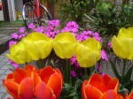 訪問相談2件、電話相談1件で午前が終わり、日々の事務業務(震災情報チェックも仲間入りです)をこなし、さっき早めに終わった理事会資料のプリント。新しい仕事に取り掛かれないと気分が少しだらけるものです。気持ちを持続させるもの事務局運営には必要な心構えですな。今日は、室内より外の方が暖かだったので、給食お弁当を食べてから本屋へ行きました。もうひとつの目的はこのページに貼る写真のストック探しでもあります。チューリップの色がとてもあざやかだった広坂のお店の前でパチリ。