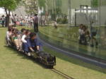 今日はゆるゆると、好天の下、社長出勤であります。残りの大きな仕事「協働をすすめる市民会議」今年度の計画案をつくります。先月の第1回会議をベースに、昨年度の振り返りからその評価。そして活動計画とスケジュール。最後に次年度への展望まで5枚になってしまいしました。(-_-;)書体は明朝Pを使ったので、結構なボリュームを一気でした。できたら帰ろうという予定が、結局いつもと同じ時間です。さらに、一気なもんですから、読んだ人にこれを伝えるには、想いや熱が冷め切ったら(一晩眠ったら)読み直しが必要という訳で、休みも後2日。あせるであります。(せめてしたいよ、2日のレンチャン休暇!)という訳で、ぶらぶら出勤の途中に、やけににぎやかな21世紀美術館。寄り道こいたら、なんと丸いドームの周囲を蒸気機関車が煙をはいて走っているではありませんか!!しかも人が乗ってます。ひと回り(360度)と思いきや、120度分程度のレールを行ったり戻ったり。(戻りはそのままでバックなんで、かっこワルー)。一周する位のアートはして欲しいなぁ・・・。