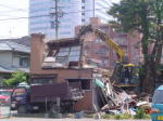 朝一番にご予約の訪問相談。昼近く、トイレの窓から昨日の朽ちた民家解体の続きの光景が目に飛び込みました。黄色の解体車が老木まで引きちぎらんとしているではありませんか。下の写真右側の老木です。デジカメを取りに戻って構えたその時、まさに落下でありました!いままでは朽ちた民家の屋根を覆っていた老木でしたが、家が撤去されたら円周が数メートルもある根元が現れ、びっくりした矢先の出来事。きっと藩政時代からの老木だったのでしょう。こうしてまた中心市街地から緑は消え、温暖化は進むのでしょう(ーー;)。今日の消去仕事は6月30日の公開プレゼンのチラシづくり。一応出来たのですが、今一納得のいかない作品です。ベタが多すぎて輪転機に紙がひっつきます。印刷屋さんに交渉のメール。ちよっと中途半端な仕事に打開策はないものかと?