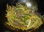 さぁ!一気に印刷だぁ!と、朝から輪転。ところが、またアクシデント発生で〜す。志半ばにして、トラブルでもないのに輪転機が「原紙を外してやり直しなさい」とピーピー鳴って、止まってしまうのです。仕方がないので、おっしゃるままにドラムを外して、原紙をはがし、インクが手や床について・・。すると働いてくれますが、次の製版をするとまた「ピーピー」とわめくのです。2〜3回目にゃ、もう付き合っていられません。ご近所の県支援センター「あいむ」さんで残りを印刷。新機種とかでグラフも美しい仕上がり。終わったのか11時半。まだ間に合います。職員で混み出す前に、昼食はお向かえの市役所食堂です。ここの380円のカレーライスが好きなんです。醤油をかけると美味しい日本カレー。そんな訳で戻ってから電話で修理を頼み、製本ホチ止め作業でやっとこさ完成\(~o~)/。夕方から在庫の少なくなった通販での事務用品探し19年度版です。カタログの文字が小さいのなんのって、本当に虫メガネで探しましたぞい!さて、もう竹の子シリーズは終わりと思ったら、そうは問屋が、です。最後に残っていた部位で、「ポテト・チンジャオロース」です。醤油で下味をつけた牛肉を、刻みニンニクをたっぷり入れた油で炒め、細切り新じゃが、ピーマン、竹の子も合わせて炒めます。最後の竹の子は中華鍋の中へでありましたぁ。
