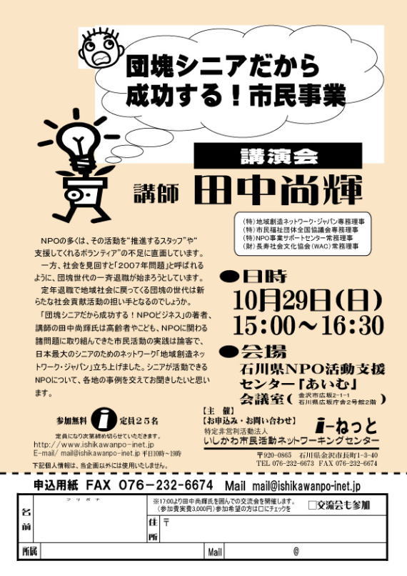 「団塊シニアだから成功する!NPOのビジネス」の著者、講師の田中尚輝氏は、高齢