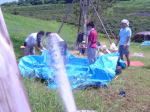 5日、6日の土日は、長坂台の山の上にある大乗寺総合丘陵公園で朝から夕方まで過ごしました。自転車で自宅から行きは25分、帰りは15分ほどです。この差は何かといえば、登りと下りの差。おかげて今日は足がだるく、通勤も他の自転車に追い抜かれっぱなしです。二日間、好天に恵まれてというより、熱波に襲われてという感じでした。「自分の責任で自由にあそぶ」冒険遊び場の一週間連続パークの始まりです。今回からニッセイ財団の物資補助で購入できたテントが3ハリ入ったので、短時間で日陰が作れました。中谷川の草刈りの仕事をつくりました。池の泥上げまでやったら、「子ども達は池遊びもできる」と頑張りましたが、完成をみずに、猛暑と戦って帰ってきただけでした。いろんな人の力がひとつになってつくられる「空間」は日常とは別の世界です。大人も遊ぶアイデアが湧き出ます。中学生も思考錯誤で水を通す竹パイプを完成させました。スゴイ!この様子は9日の北陸中日新聞に大きく掲載の予定だそうです。丸一日熱心に取材されたの記者さん。お疲れさまでした。