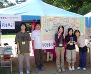 ●「ボランタリースピリッツYesNoゲーム」って何? ちょっといわく付きのゲーム。そもそも行政機関誌掲載用に考えた初稿が、校正を繰り返す内、原型を留めぬ姿になってしまいました。それを見かねた金沢青年会議所屋外ブース担当の高田さんの熱意が、学生ボランティアを動かしました。2人の男女学生がi-ねっとに来て、初稿を3尺6尺のパネルに手書き。これを歩行者の多いテント前に吊るしました。 「ボランティア活動は、全て無償で行うべき」からスタートし、YesかNoか答えながら先に進んで行きます。ゴールには「救済」「動員」「自発」「自由」「組織」「起業」の6つのタイプが用意され、その意味を知るために赤紫の布で囲まれた個室「NPO占いの館」に案内されます。中には占い師(?)が常駐し、タイプの特徴的性格、気質、表現などを指摘。貢献活動で努力すべきポイントを個別にアドバイスするというもの。 時々人波が途切れはするものの、一時は順番までつく盛況で、中には法人化への真剣な相談もあり、60名を超える占いに、さすがに占い師の喉はカラカラ。NPO関連図書は1冊しか売れませんでしたが、アイデアと工夫で勝負をかけた「占い」というフレーズは、いつもの「NPO相談会」以上に多くの人を引き付けたように思います。